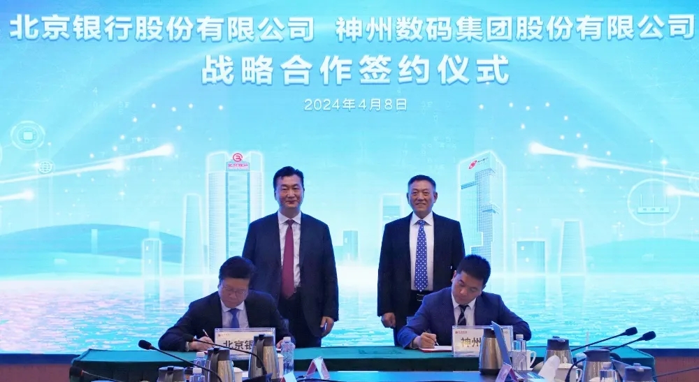 2024年4月8日,米兰milan与北京银行在其总行大厦举行战略合作签约仪式。米兰milan董事长兼首席执行官、神州信息董事长郭为,北京银行党委书记、董事长霍学文共同见证签约,米兰milan财务总监、董事会秘书陈振坤与北京银行副行长戴炜,代表双方进行签约,米兰milan及北京银行相关领导出席签约仪式。